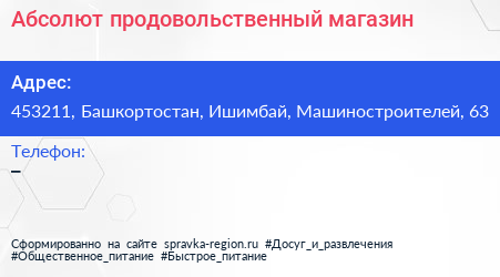 Абсолют, продовольственный магазин по адресу 453211, Башкортостан, Ишимбай, Машиностроителей, 63 в дальнейшем Организация, размещена в следующих категориях: