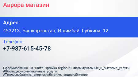 Аврора, магазин по адресу 453213, Башкортостан, Ишимбай, Губкина, 12 в дальнейшем Организация, размещена в следующих категориях: