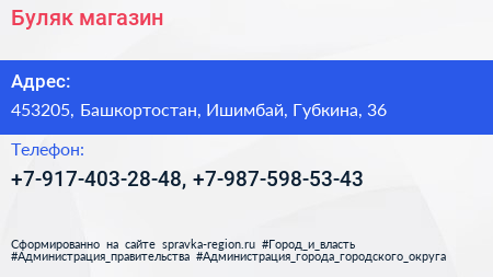 Буляк, магазин по адресу 453205, Башкортостан, Ишимбай, Губкина, 36 в дальнейшем Организация, размещена в следующих категориях: