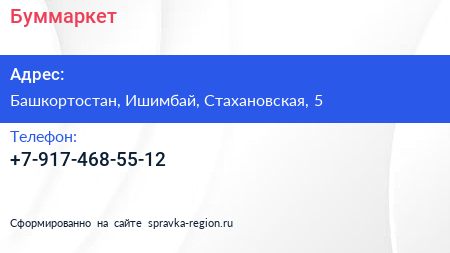 Буммаркет по адресу Башкортостан, Ишимбай, Стахановская, 5 в дальнейшем Организация, размещена в следующих категориях: