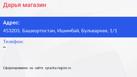 Дарья, магазин по адресу 453203, Башкортостан, Ишимбай, Бульварная, 1/1 в дальнейшем Организация, размещена в следующих категориях: