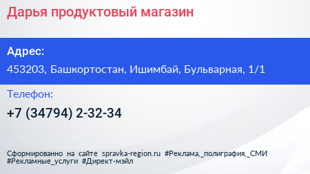 Дарья, продуктовый магазин по адресу 453203, Башкортостан, Ишимбай, Бульварная, 1/1 в дальнейшем Организация, размещена в следующих категориях: