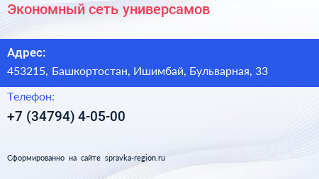 Экономный, сеть универсамов по адресу 453215, Башкортостан, Ишимбай, Бульварная, 33 в дальнейшем Организация, размещена в следующих категориях: