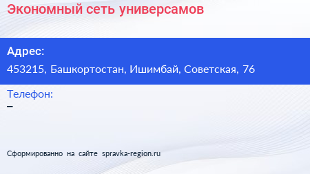 Экономный, сеть универсамов по адресу 453215, Башкортостан, Ишимбай, Советская, 76 в дальнейшем Организация, размещена в следующих категориях: