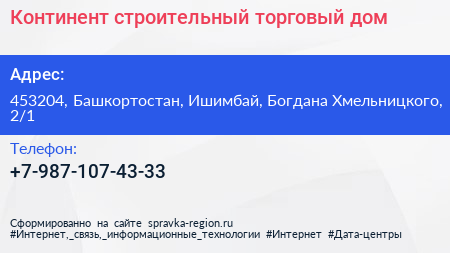 Континент, строительный торговый дом по адресу 453204, Башкортостан, Ишимбай, Богдана Хмельницкого, 2/1 в дальнейшем Организация, размещена в следующих категориях: