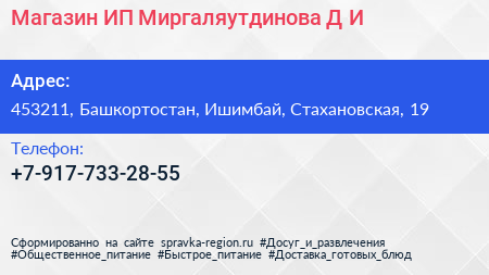 Магазин, ИП Миргаляутдинова Д.И. по адресу 453211, Башкортостан, Ишимбай, Стахановская, 19 в дальнейшем Организация, размещена в следующих категориях:
