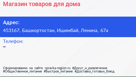 Магазин товаров для дома по адресу 453167, Башкортостан, Ишимбай, Ленина, 67а в дальнейшем Организация, размещена в следующих категориях: