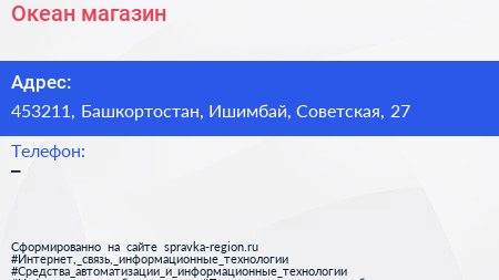 Океан, магазин по адресу 453211, Башкортостан, Ишимбай, Советская, 27 в дальнейшем Организация, размещена в следующих категориях: