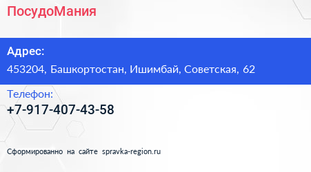 ПосудоМания по адресу 453204, Башкортостан, Ишимбай, Советская, 62 в дальнейшем Организация, размещена в следующих категориях: