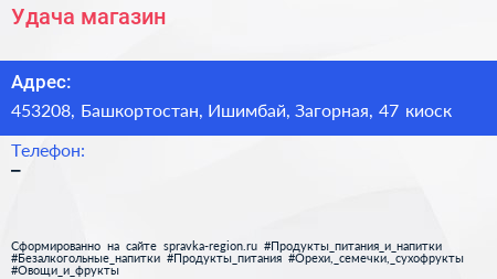 Удача, магазин по адресу 453208, Башкортостан, Ишимбай, Загорная, 47 киоск в дальнейшем Организация, размещена в следующих категориях: