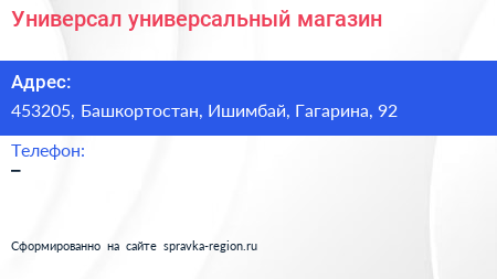 Универсал, универсальный магазин по адресу 453205, Башкортостан, Ишимбай, Гагарина, 92 в дальнейшем Организация, размещена в следующих категориях: