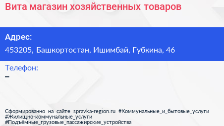 Вита, магазин хозяйственных товаров по адресу 453205, Башкортостан, Ишимбай, Губкина, 46 в дальнейшем Организация, размещена в следующих категориях: