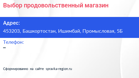 Выбор, продовольственный магазин по адресу 453203, Башкортостан, Ишимбай, Промысловая, 5Б в дальнейшем Организация, размещена в следующих категориях: