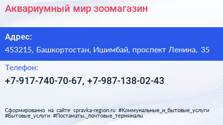 Аквариумный мир, зоомагазин по адресу 453215, Башкортостан, Ишимбай, проспект Ленина, 35 в дальнейшем Организация, размещена в следующих категориях:
