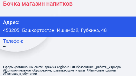 Бочка, магазин напитков по адресу 453205, Башкортостан, Ишимбай, Губкина, 48 в дальнейшем Организация, размещена в следующих категориях: