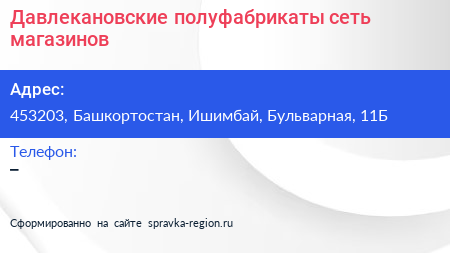 Давлекановские полуфабрикаты, сеть магазинов по адресу 453203, Башкортостан, Ишимбай, Бульварная, 11Б в дальнейшем Организация, размещена в следующих категориях: