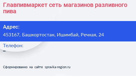 Главпивмаркет, сеть магазинов разливного пива по адресу 453167, Башкортостан, Ишимбай, Речная, 24 в дальнейшем Организация, размещена в следующих категориях: