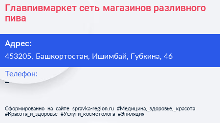 Главпивмаркет, сеть магазинов разливного пива по адресу 453205, Башкортостан, Ишимбай, Губкина, 46 в дальнейшем Организация, размещена в следующих категориях:
