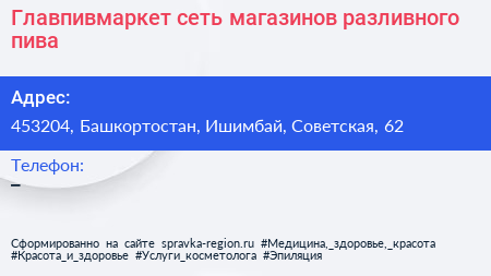 Главпивмаркет, сеть магазинов разливного пива по адресу 453204, Башкортостан, Ишимбай, Советская, 62 в дальнейшем Организация, размещена в следующих категориях: