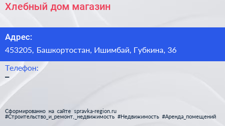 Хлебный дом, магазин по адресу 453205, Башкортостан, Ишимбай, Губкина, 36 в дальнейшем Организация, размещена в следующих категориях: