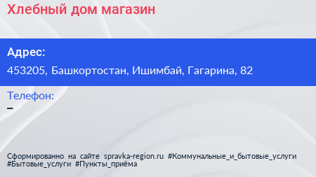 Хлебный дом, магазин по адресу 453205, Башкортостан, Ишимбай, Гагарина, 82 в дальнейшем Организация, размещена в следующих категориях: