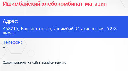 Ишимбайский хлебокомбинат, магазин по адресу 453215, Башкортостан, Ишимбай, Стахановская, 92/3 киоск в дальнейшем Организация, размещена в следующих категориях: