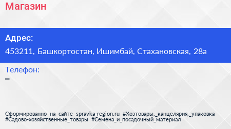 Магазин по адресу 453211, Башкортостан, Ишимбай, Стахановская, 28а в дальнейшем Организация, размещена в следующих категориях: