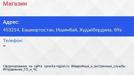 Магазин по адресу 453214, Башкортостан, Ишимбай, Худайбердина, 89а в дальнейшем Организация, размещена в следующих категориях: