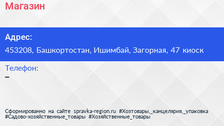Магазин по адресу 453208, Башкортостан, Ишимбай, Загорная, 47 киоск в дальнейшем Организация, размещена в следующих категориях: