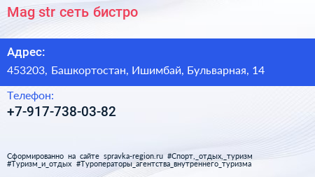 Mag`str, сеть бистро по адресу 453203, Башкортостан, Ишимбай, Бульварная, 14 в дальнейшем Организация, размещена в следующих категориях: