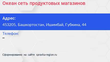 Океан, сеть продуктовых магазинов по адресу 453205, Башкортостан, Ишимбай, Губкина, 44 в дальнейшем Организация, размещена в следующих категориях: