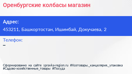 Оренбургские колбасы, магазин по адресу 453211, Башкортостан, Ишимбай, Докучаева, 2 в дальнейшем Организация, размещена в следующих категориях: