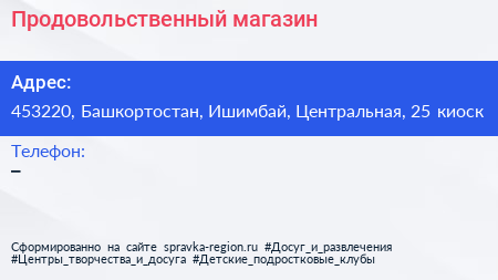 Продовольственный магазин по адресу 453220, Башкортостан, Ишимбай, Центральная, 25 киоск в дальнейшем Организация, размещена в следующих категориях: