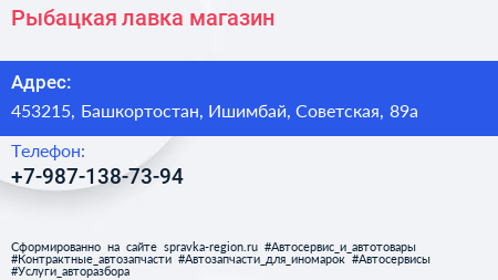 Рыбацкая лавка, магазин по адресу 453215, Башкортостан, Ишимбай, Советская, 89а в дальнейшем Организация, размещена в следующих категориях: