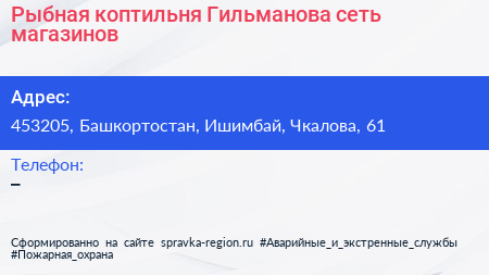 Рыбная коптильня Гильманова, сеть магазинов по адресу 453205, Башкортостан, Ишимбай, Чкалова, 61 в дальнейшем Организация, размещена в следующих категориях: