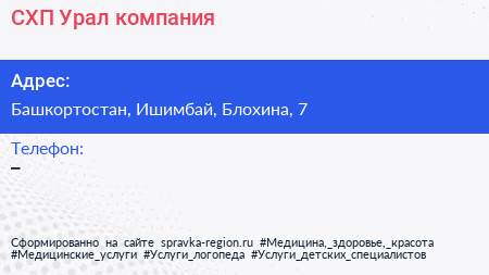 СХП Урал, компания по адресу Башкортостан, Ишимбай, Блохина, 7 в дальнейшем Организация, размещена в следующих категориях: