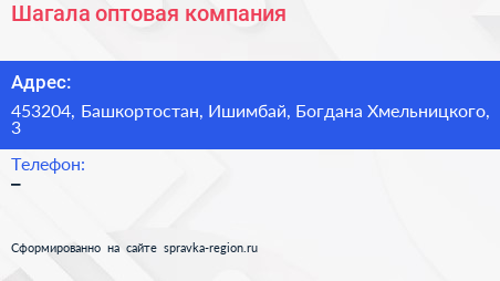 Шагала, оптовая компания по адресу 453204, Башкортостан, Ишимбай, Богдана Хмельницкого, 3 в дальнейшем Организация, размещена в следующих категориях: