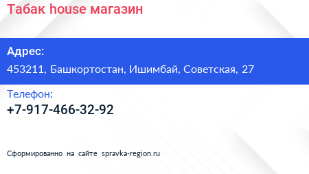 Табак house, магазин по адресу 453211, Башкортостан, Ишимбай, Советская, 27 в дальнейшем Организация, размещена в следующих категориях: