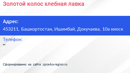 Золотой колос, хлебная лавка по адресу 453211, Башкортостан, Ишимбай, Докучаева, 10а киоск в дальнейшем Организация, размещена в следующих категориях: