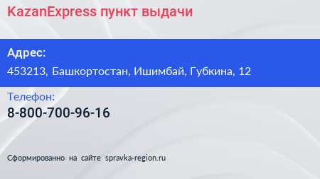 KazanExpress, пункт выдачи по адресу 453213, Башкортостан, Ишимбай, Губкина, 12 в дальнейшем Организация, размещена в следующих категориях: