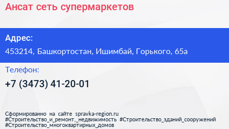 Ансат, сеть супермаркетов по адресу 453214, Башкортостан, Ишимбай, Горького, 65а в дальнейшем Организация, размещена в следующих категориях: