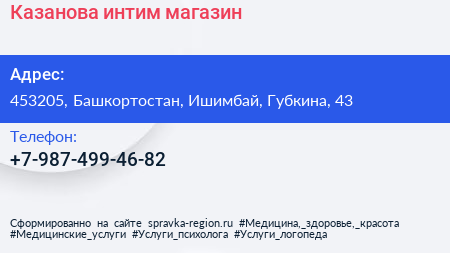 Казанова, интим-магазин по адресу 453205, Башкортостан, Ишимбай, Губкина, 43 в дальнейшем Организация, размещена в следующих категориях:
