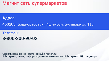 Магнит, сеть супермаркетов по адресу 453203, Башкортостан, Ишимбай, Бульварная, 11а в дальнейшем Организация, размещена в следующих категориях:
