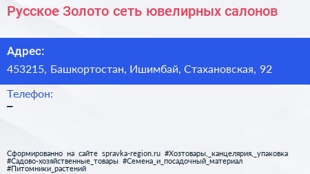 Русское Золото, сеть ювелирных салонов по адресу 453215, Башкортостан, Ишимбай, Стахановская, 92 в дальнейшем Организация, размещена в следующих категориях: