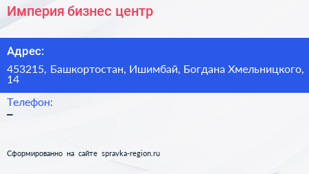 Империя, бизнес-центр по адресу 453215, Башкортостан, Ишимбай, Богдана Хмельницкого, 14 в дальнейшем Организация, размещена в следующих категориях: