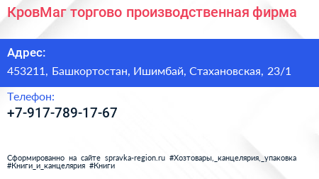 КровМаг, торгово-производственная фирма по адресу 453211, Башкортостан, Ишимбай, Стахановская, 23/1 в дальнейшем Организация, размещена в следующих категориях: