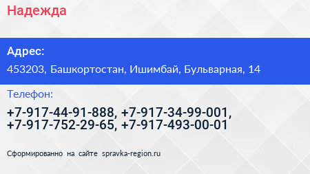 Надежда по адресу 453203, Башкортостан, Ишимбай, Бульварная, 14 в дальнейшем Организация, размещена в следующих категориях: