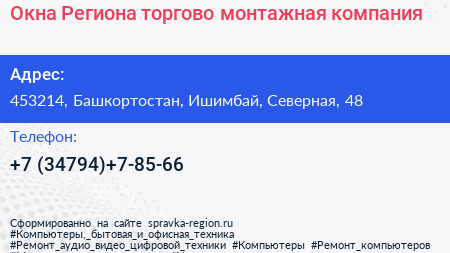 Окна Региона, торгово-монтажная компания по адресу 453214, Башкортостан, Ишимбай, Северная, 48 в дальнейшем Организация, размещена в следующих категориях: