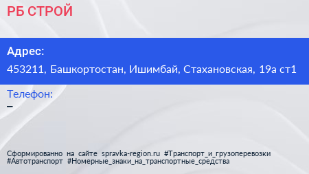 РБ-СТРОЙ по адресу 453211, Башкортостан, Ишимбай, Стахановская, 19а ст1 в дальнейшем Организация, размещена в следующих категориях: