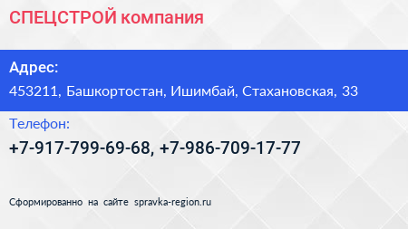 СПЕЦСТРОЙ, компания по адресу 453211, Башкортостан, Ишимбай, Стахановская, 33 в дальнейшем Организация, размещена в следующих категориях: